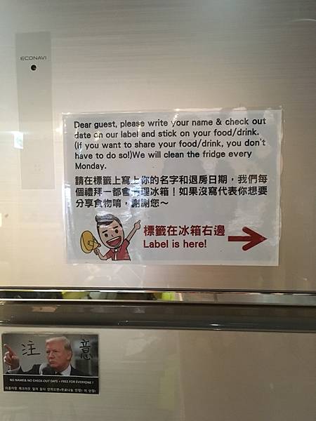 這裡有簡易的廚房還有24小時的現磨咖啡、紅茶、小餅乾滿足嘴饞的你;這小廚房可讓我眼睛為之一亮,有小電爐可煮熱食,也有果汁機、電鍋呢!真是應有盡有。而每天早上7-11點有供應簡便的土司等早餐喔~~有大冰箱可以冰東西,但要記得貼上名字與退宿日期喔!筆和標籤都在冰箱旁邊,也太貼心了吧!我要落淚了!