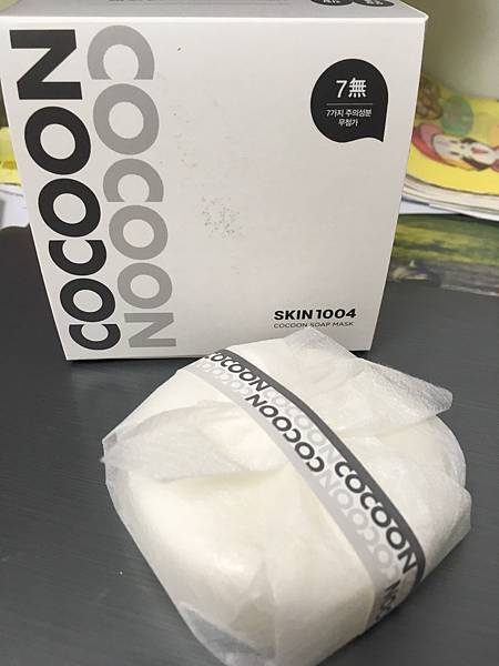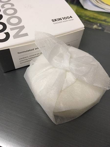 skin1004 蠶絲毛孔面膜皂的外盒設計簡約,打開紙盒後,店家細心的用特殊的包裝紙讓皂不與紙盒摩擦並呈現簡約的美感,讓我想到日式和菓子呦~~